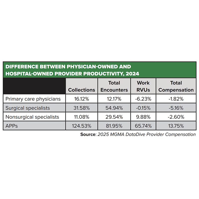 Physicians and APPs in physician-owned practices posted larger gains in total encounters compared to their counterparts in hospital-/system-owned practices, though the latter group of physicians in primary care and surgical specialties posted higher median work RVUs than those in private practices. Total encounters reflect all direct provider-to-patient interactions regardless of setting, including tele-visits and e-visits. Work RVUs (wRVUs) also quantify productivity and account for the complexity of the visits.