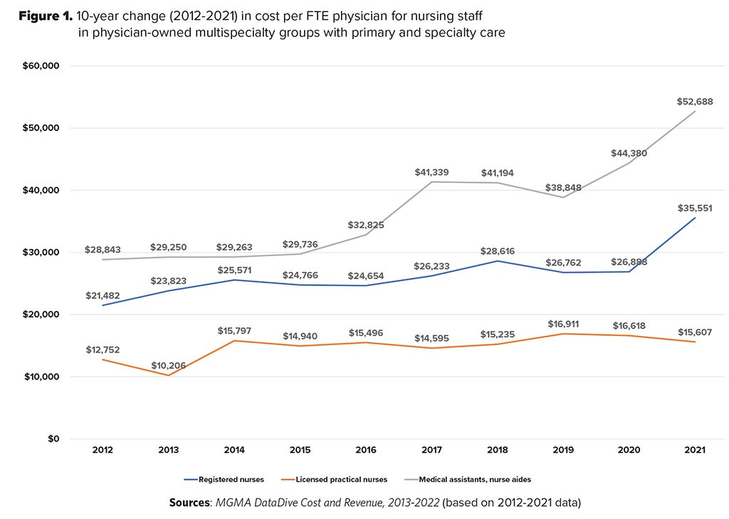 Drilling down, much of the increase in staff costs can be attributed to the increase in the cost of nursing staff. Figure 1 displays how the cost per FTE physician for registered nurses (RNs), licensed practical nurses (LPNs), and medical assistants (MAs) has changed over the past 10 years. The graph shows how physician-owned multispecialty groups with primary and specialty care experienced a substantial increase in RN and MA costs in the most recent year.