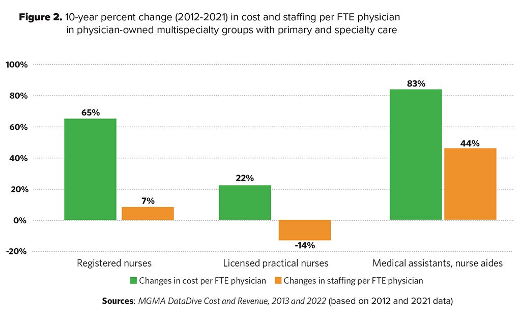 Since total staff cost is a function of the number of staff members and their average compensation, Figure 2 shows the percent change in total cost along with the change in staffing levels. Examining the graph, it is apparent that the increase in cost of MAs is largely driven by an increase in the staffing level; however, while LPN costs have increased by 22% in the 10 years, their staffing level actually decreased 14%. Most importantly, physician-owned multispecialty groups with primary and specialty care saw their RN staffing cost per FTE physician surge by 65% despite only increasing their RN staffing levels by 7%.