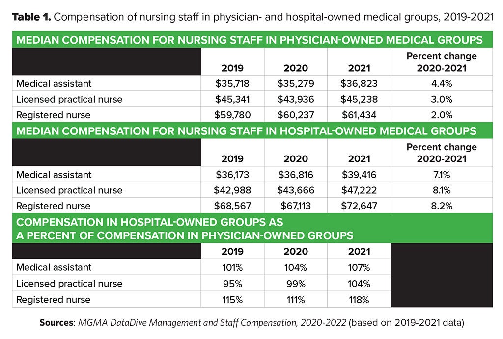 While the MGMA DataDive Cost and Revenue records practice expenses revenue and staffing information, the MGMA DataDive Management and Staff Compensation publishes compensation and fringe benefit information for practice executives, managers, and staff members. Table 1 shows the median compensation paid by physician-owned and hospital-owned medical groups for their nursing staff during the three years of the COVID pandemic.