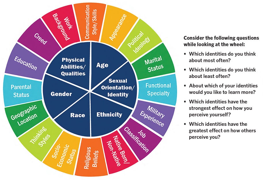 An identity wheel (Figure 1) is one type of visual tool that depicts different aspects of how people identify themselves, including gender, race, socioeconomic status, education and other factors.