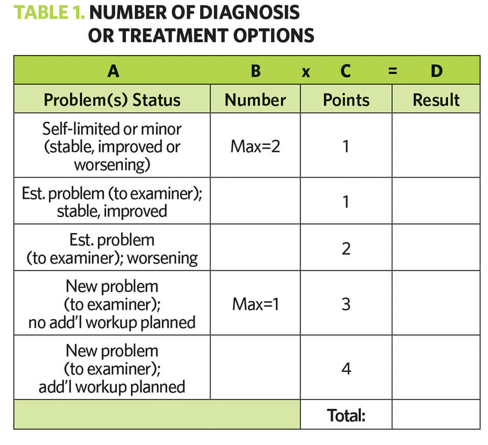 Those exact terms are not required in the documentation, but the concepts must be clear. New problems are defined in the guidelines as a presenting problem without an established diagnosis. They are then categorized as either with additional workup or without additional workup. Additional workup examples are lab or radiology services or a request for a consult. The number of diagnosis or management options are point-based (see scoring in Table 1) and categorized as: