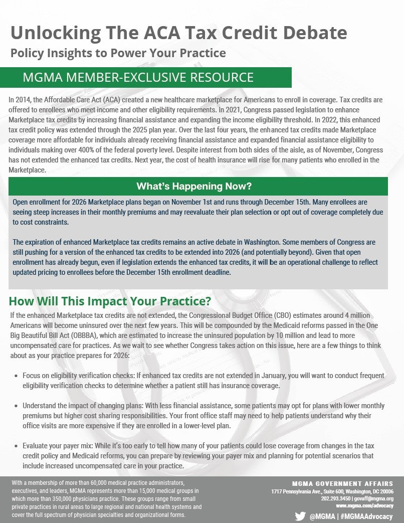 In 2022, this enhanced tax credit policy was extended through the 2025 plan year. Over the last four years, the enhanced tax credits made Marketplace coverage more affordable for individuals already receiving financial assistance and expanded financial assistance eligibility to individuals making over 400% of the federal poverty level. Despite interest from both sides of the aisle, as of November, Congress has not extended the enhanced tax credits. Next year, the cost of health insurance will rise for many patients who enrolled in the Marketplace.