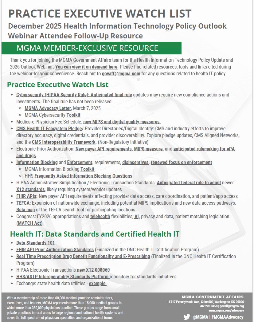 Thank you for joining the MGMA Government Affairs team for the Health Information Technology Policy Update and 2026 Outlook Webinar. You can view it on demand as an MGMA member by signing in. You can find related resources, tools and links cited during the webinar for your convenience. Reach out to govaff@mgma.com for any questions related to health IT policy.