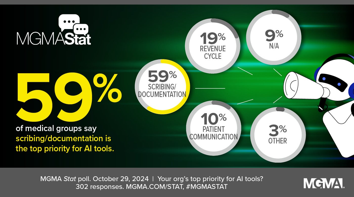 An Oct. 29, 2024, MGMA Stat poll found that nearly six medical group leaders in 10 (59%) cited scribing/documentation tools as their organizations’ top priority among AI tools, ahead of revenue cycle AI (19%), patient communication AI (10%) and “other” (3%). An additional 9% of respondents selected “not applicable,” indicating they currently have no plans for AI. The poll had 302 responses.