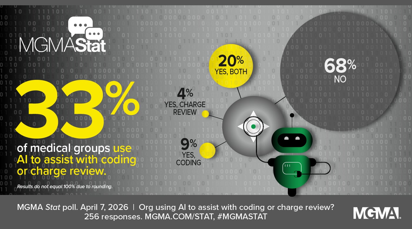 - Has your organization added AI for coding and/or charge review? Share your story in the MGMA Member Community or email us at connection@mgma.com.