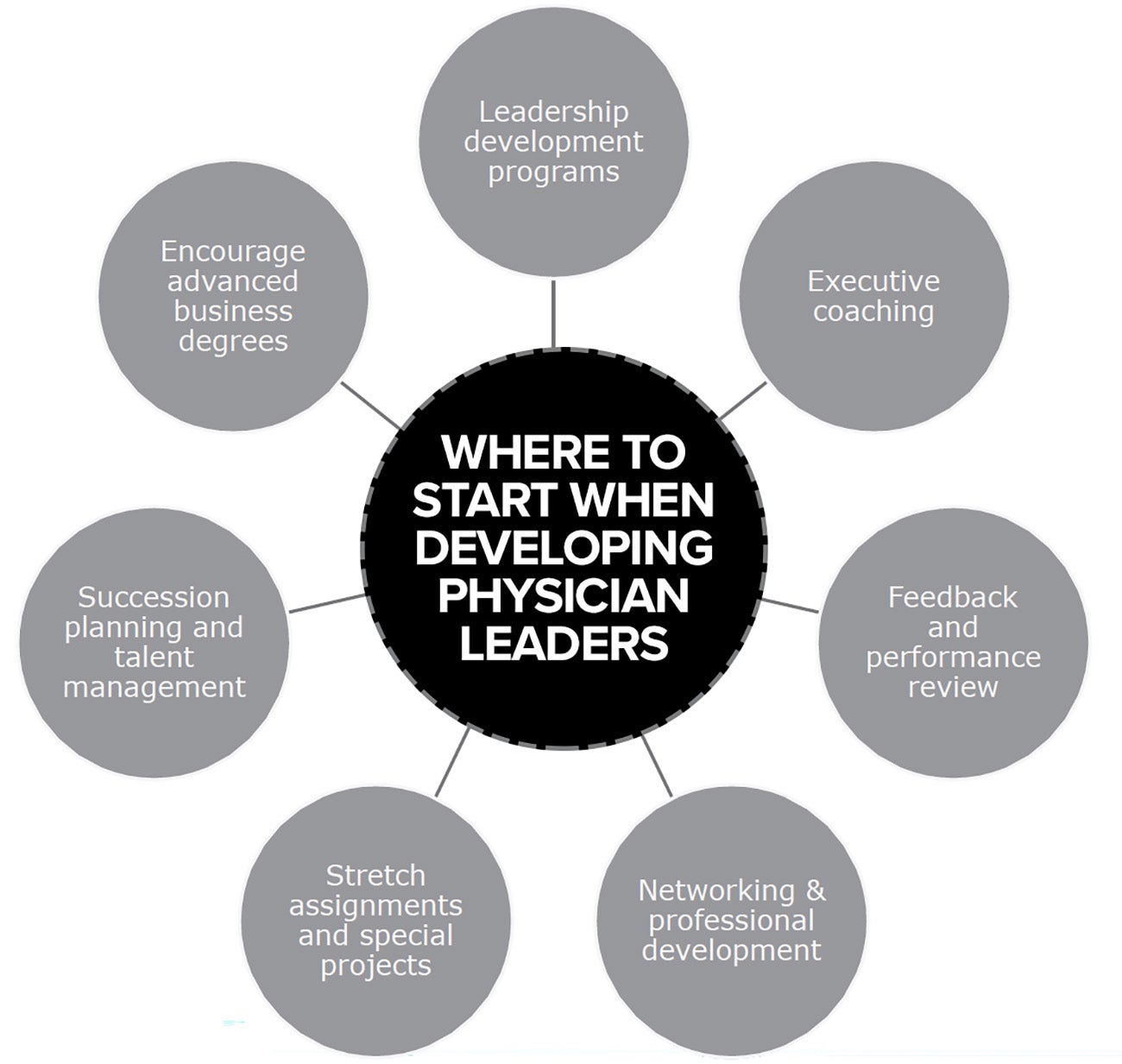 Healthcare organizations have several avenues to consider for successfully preparing a physician for a senior leadership role (see figure above) in conjunction with assessing candidates for the requisite skills.