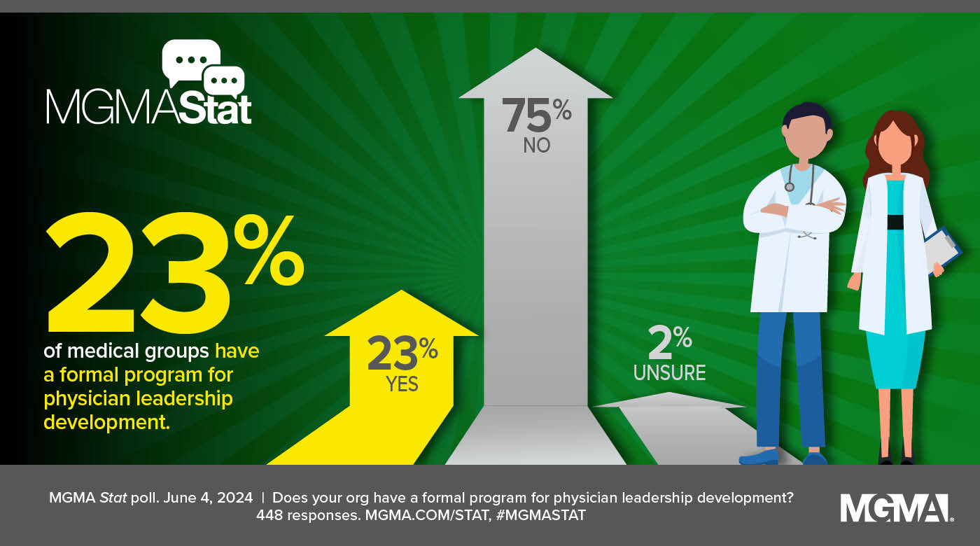A June 4, 2024, MGMA Stat poll found that 23% of medial group leaders said their organizations have a formal physician leadership development program, while 75% do not and another 2% reported they were unsure. The poll had 448 applicable responses.
