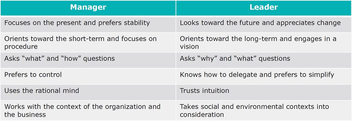 Source: Reynolds KA. “MGMA 2022: Leadership vs. management.” Medical Economics. Oct. 10, 2022. Available from: https://www.medicaleconomics.com/view/mgma-2022-the-difference-between-a-leader-and-a-manager .