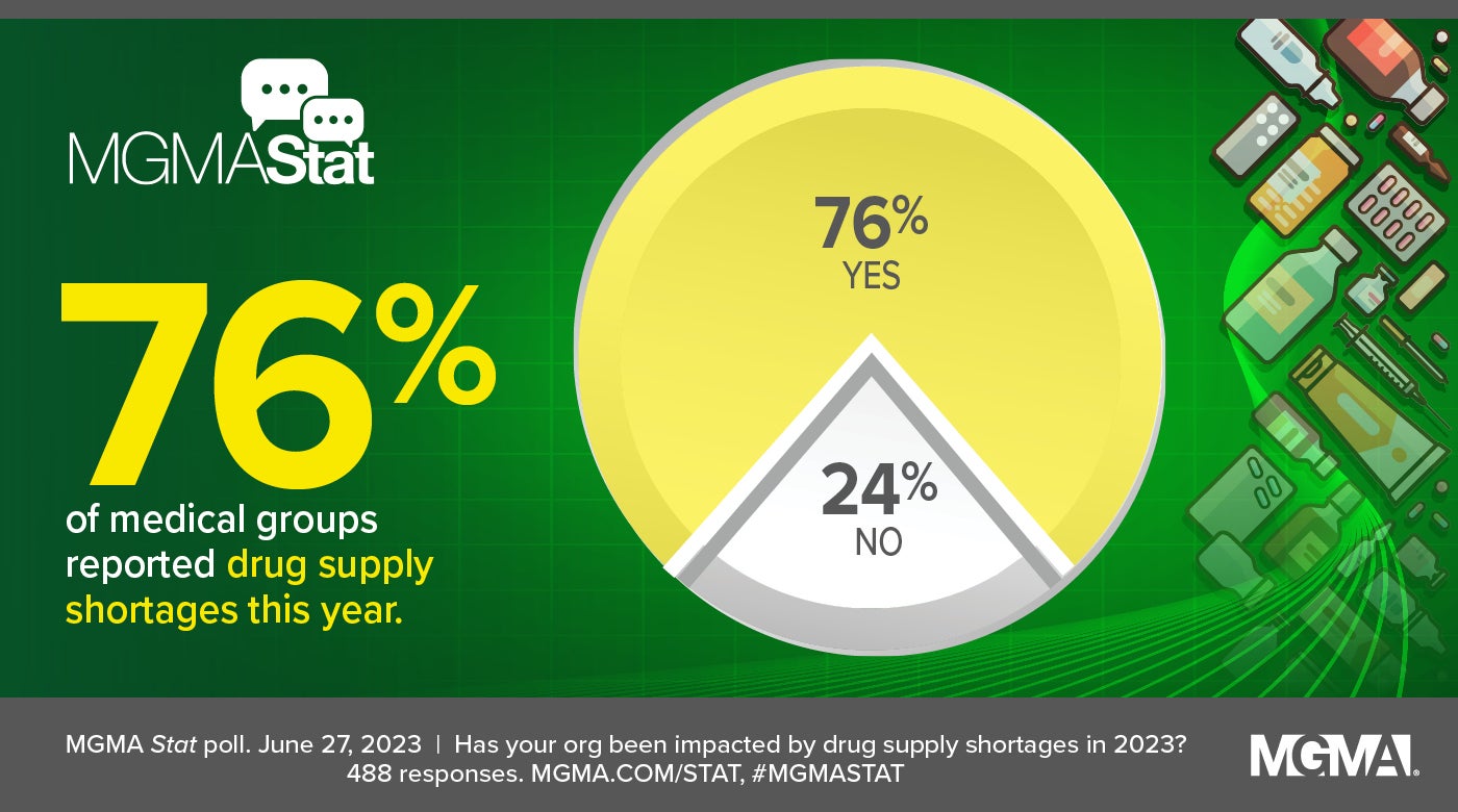 A June 27, 2023, MGMA Stat poll found that more than three in four (76%) medical groups report being impacted by drug supply shortages in 2023, while only 24% did not. The poll had 488 applicable responses.