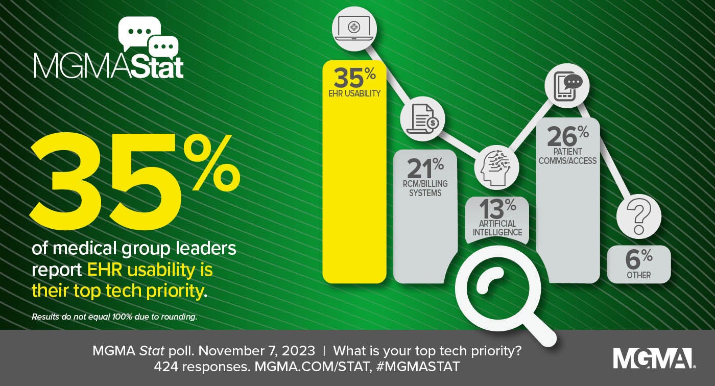 A Nov. 7, 2023, MGMA Stat poll asked medical group leaders to get specific about their top tech priorities, and it turns out that AI isn’t always top of mind: