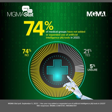- Only about one in five (21%) of medical groups added or expanded use of AI tools as of a Sept. 5, 2023, poll.