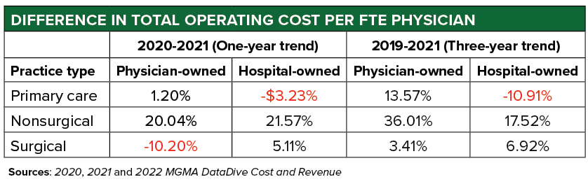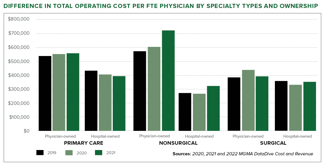 - Hospital-owned practices saw some of the most significant jumps in operating costs per FTE physician from 2020 to 2021, while hospital-owned primary care practices saw a nearly 11% decline year over year.