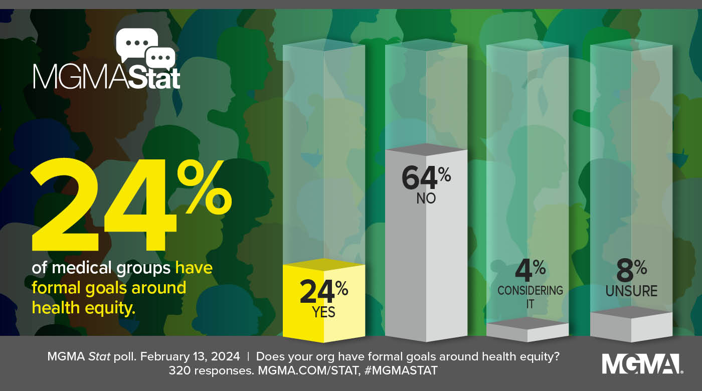 However, the formalization of those goals still is nascent. A Feb. 13, 2024, MGMA Stat poll found that only about one medical group leader in four (24%) reports that their organization has formal health equity goals, and only another 4% note they are considering adding goals. Almost two-thirds (64%) said they have no formal goals, and another 8% were unsure. The poll had 320 applicable responses.