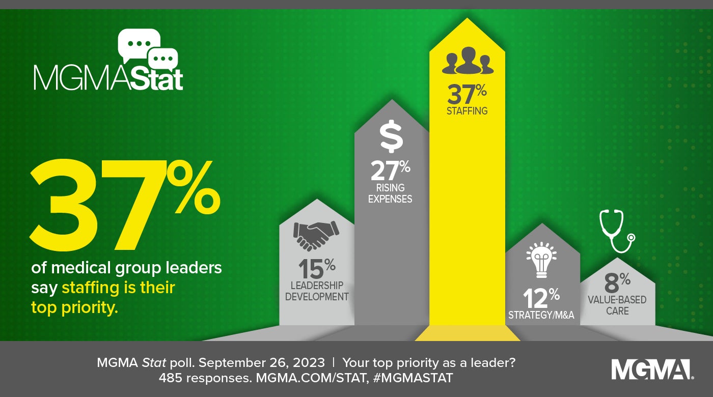 A Sept. 26, 2023, MGMA Stat poll found that staffing — previously cited as the top challenge for medical groups leaders in 2021 and 2022 — was the biggest priority for practice leaders as they head into the fall and winter months, with 37% of all responses. Behind staffing were: