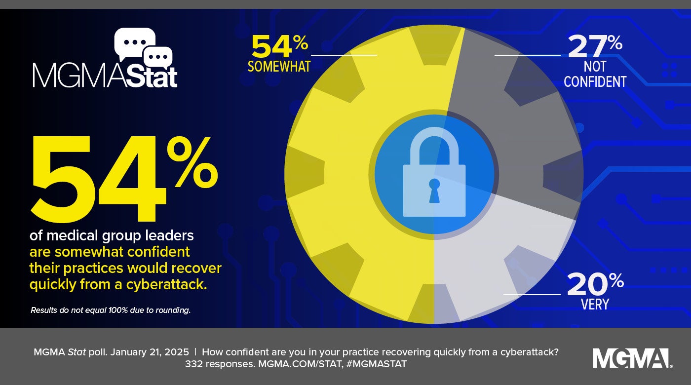 Despite the ongoing threats, most medical group leaders signal some degree of readiness to handle the threats when they manifest into attacks: More than half (54%) say they are somewhat confident their organizations would quickly recover from a cyberattack, while another 20% were very confident and more than one in four (27%) medical group leaders say they are not confident. The poll had 332 applicable responses.
