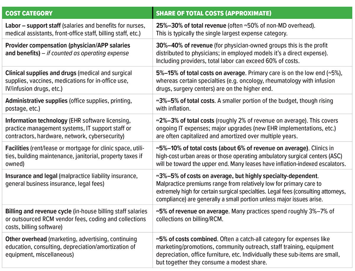 Medical practice operating expenses fall into several core categories, summarized in the table below. [Actual benchmarks vary by specialty and size, available within MGMA DataDive.]