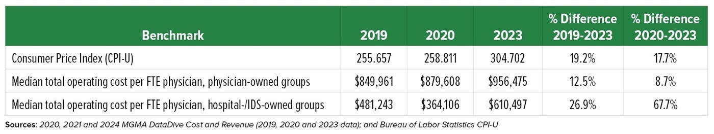 Looking at pre-pandemic and post-pandemic benchmarks and the Consumer Price Index, physician-owned multispecialty groups vastly outperformed their hospital- and system-owned counterparts in controlling operating costs. From 2019 and 2022 to 2023, these groups not only contained costs more effectively but also kept expense growth below the rate of inflation. In contrast, hospital- and IDS-owned practices — often part of larger health systems — continued to report higher costs, which are frequently subsidized by their parent organizations.