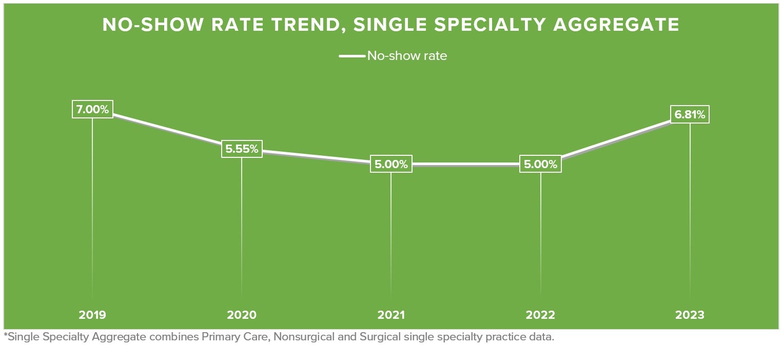 MGMA DataDive Practice Operations data show that the single-specialty aggregate no-show rate — combining primary care, nonsurgical and surgical single-specialty practice data — fell to 5.55% in 2020 and remained at 5% in 2021 and 2022. However, it rose to 6.81% in 2023, nearing the pre-pandemic benchmark of 7% recorded in 2019.