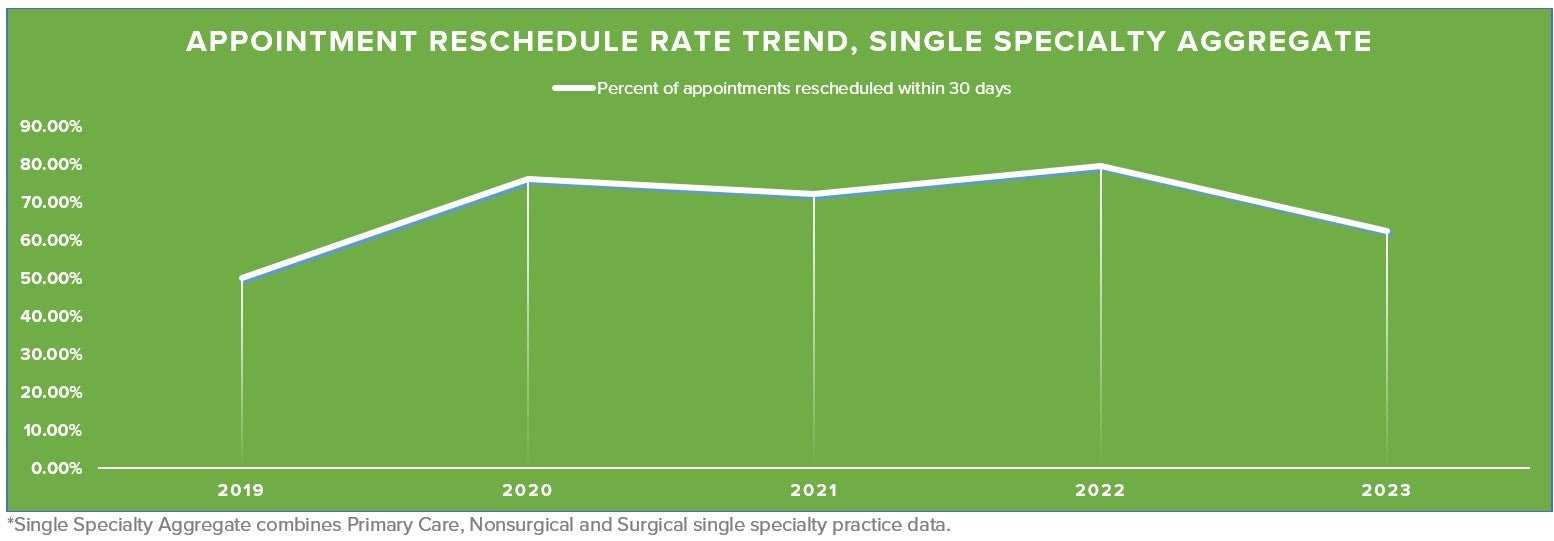 - Gradual return to in-person care: As daily routines returned to pre-pandemic norms in 2022 and 2023 (e.g., commutes, in-person work), the same factors that often caused missed or forgotten appointments before COVID-19 reintroduced scheduling complexities for both patients and practices. [See the appointment reschedule rate trend below, which shows a higher percentage of appointments rescheduled within 30 days from 2020 to 2022 before returning to 2019 levels in 2023.]
