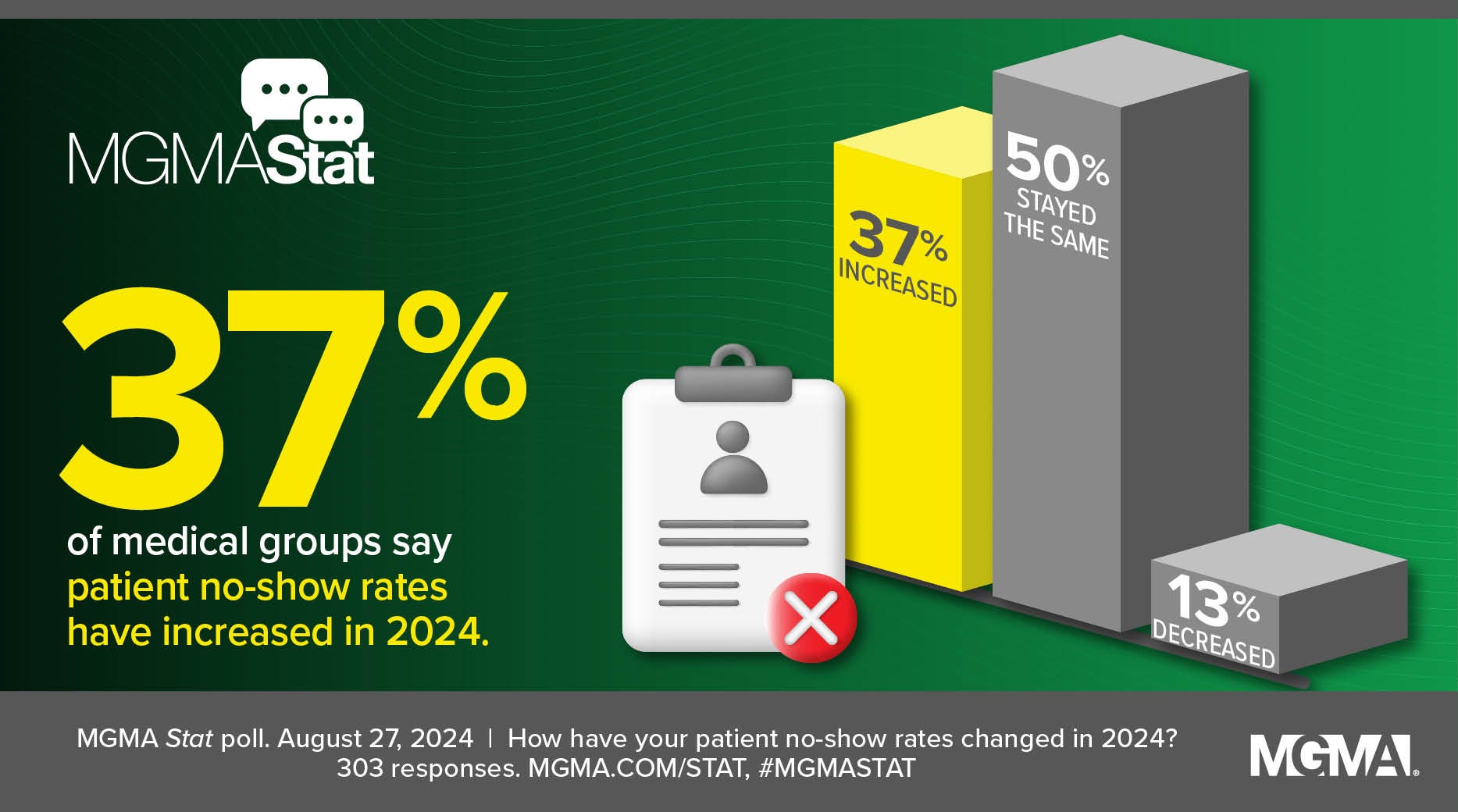 An Aug. 27, 2024, MGMA Stat poll found that six medical groups in 10 (63%) have seen their patient no-show rates stay the same (50%) or decrease (13%) in 2024, while no-show rates increased for 37% of responding groups. The poll had 303 applicable responses.