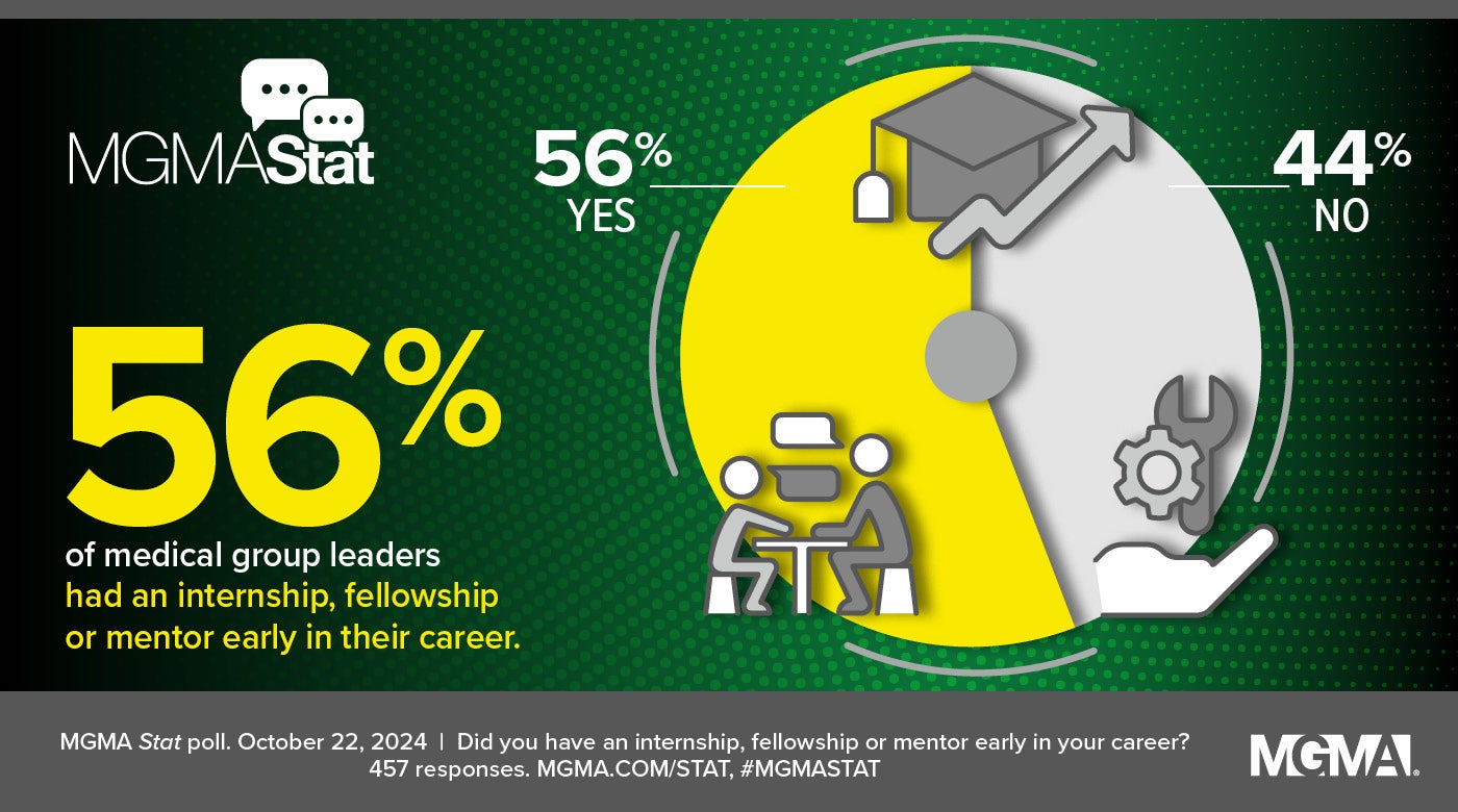 As such, most medical group leaders (56%) report that they had an internship, fellowship or mentor early in their career, while 44% did not, according to an Oct. 22, 2024, MGMA Stat poll with 457 applicable responses.