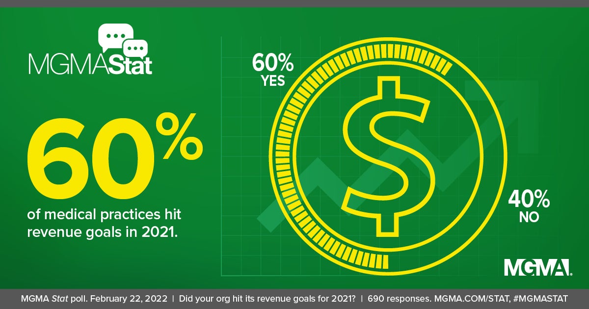 A Feb. 22, 2022, MGMA Stat poll found that 60% of medical practices met their revenue goals while 40% did not. The poll had 690 applicable responses.