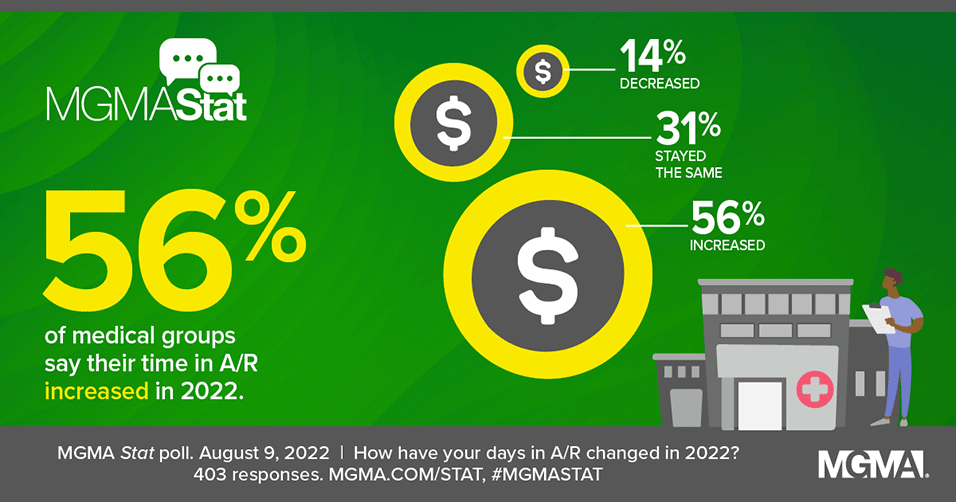 That pinch on patients’ personal finances translates directly into how well some medical practices’ collections perform. An Aug. 9, 2022, MGMA Stat poll asked medical practices how their collections — as measured in days in A/R — have changed in 2022. The majority (56%) said days in A/R have increased, while 31% said days in A/R have stayed the same, and 14% report days in A/R have decreased thus far in 2022.