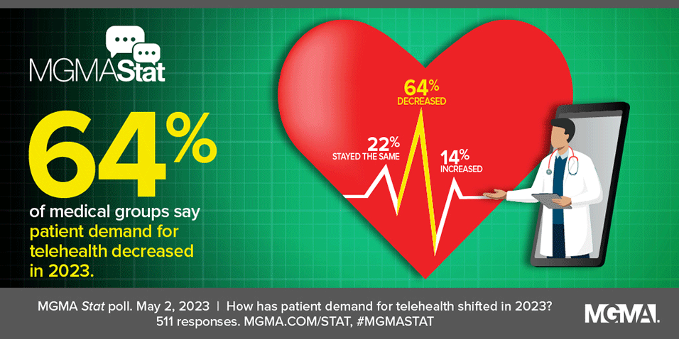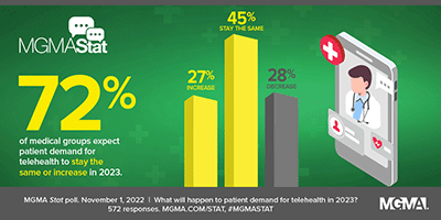 These results represent a significant shift from a Nov. 3, 2022, MGMA Stat poll that found almost half (45%) of medical group leaders predicting no change in patients’ demand for telehealth this year, with the remaining respondents split between expecting an increase (27%) and a decrease (28%).