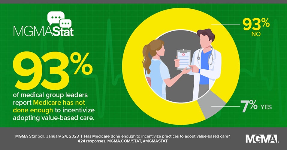 A January 24, 2023, MGMA Stat poll asked medical groups if Medicare done enough to incentivize practices to adopt value-based care? The majority (93%) answered “no.”