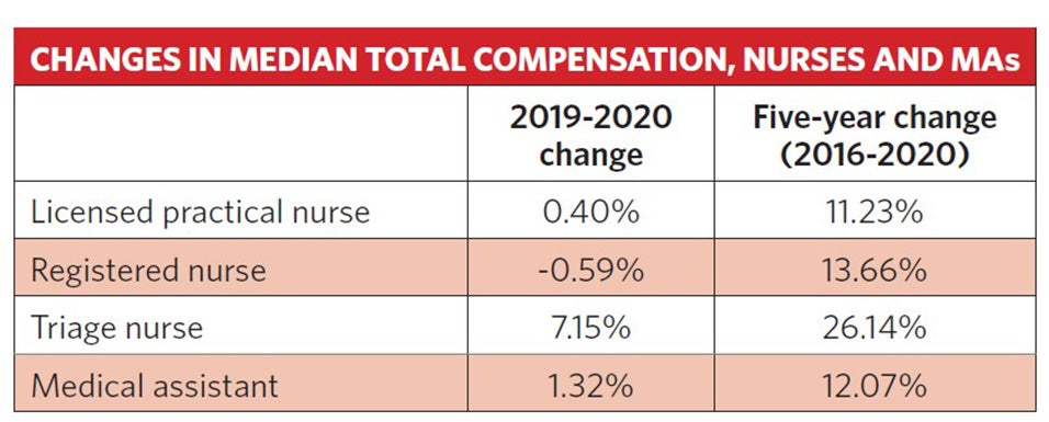 Given that one-third of medical practices reduced staff compensation in the early months of the COVID-19 pandemic, it’s clear that the increased demand for these workers — along with improving visit volumes following vaccine rollout — has made the temporary stagnation of nurse and MA pay levels a thing of the past, with practices frequently noting their current compensation levels struggle to keep pace with incentives offered by large systems and hospitals.