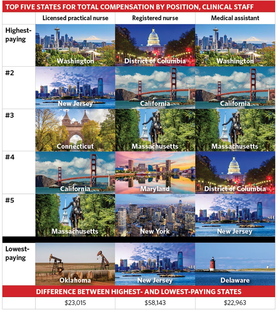 The data report highlighted coastal areas generally as those ranked highest for total compensation for licensed practical nurses (LPNs), registered nurses (RNs) and MAs.