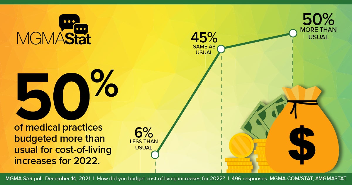A Dec. 14, 2021, MGMA Stat poll found that half of medical practices (50%) budgeted more than usual for workers’ cost-of-living increases for 2022, while 45% say they budgeted their usual annual increases and only 6% reported budgeting “less than usual” for next year.