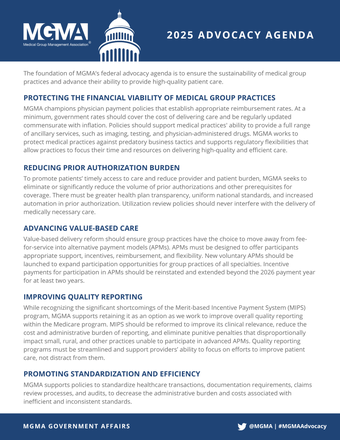 The foundation of MGMA’s federal advocacy agenda is to ensure the sustainability of medical group