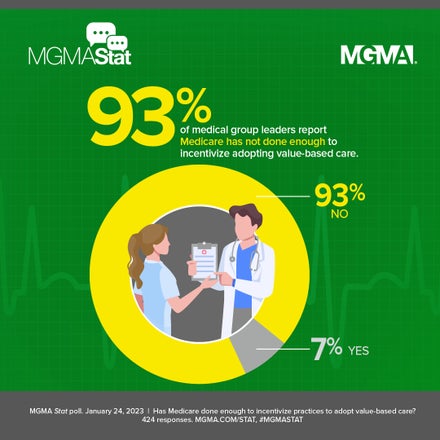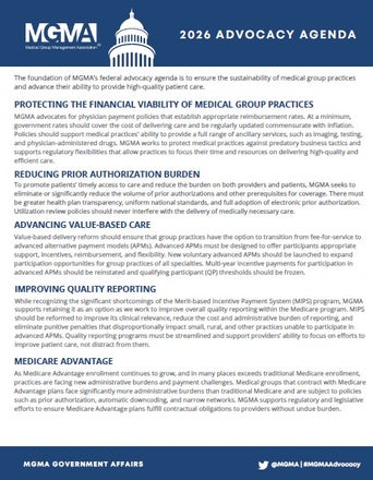MGMA supports policies that ensure group practices have the choice to move away from fee-for-service and into value-based payment arrangements, such as alternative payment models (APMs). We encourage policies that launch new voluntary APMs for all specialties designed to offer participants appropriate support, incentives, reimbursement, and flexibility.