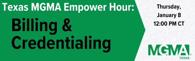 Join us for Texas MGMA’s January Empower Hour on Billing & Credentialling, an interactive session designed to bring medical group leaders together to connect with chapter leadership, share challenges, and exchange best practices. This Empower Hour will focus on billing and credentialing, highlighting common pain points, process improvements, and practical strategies to support accuracy, compliance, and operational efficiency. Through open discussion and peer-to-peer learning, participants will gain valuable insights into managing complex billing and credentialing workflows and leave with actionable ideas they can immediately apply within their organizations.